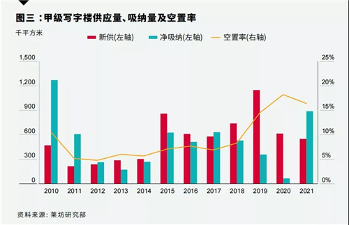 萊坊日前發(fā)布2021年第四季度北京甲級寫字樓市場報告顯示,第四季度,北京甲級寫字樓市場平均租金止跌反彈,環(huán)比上升0.6%至每月每平方米324元,全市新增甲級寫字樓面積122010平方米。市場需求持續(xù)回暖,全市平均空置率環(huán)比下降1.6個百分點,凈吸納量297580平方米。