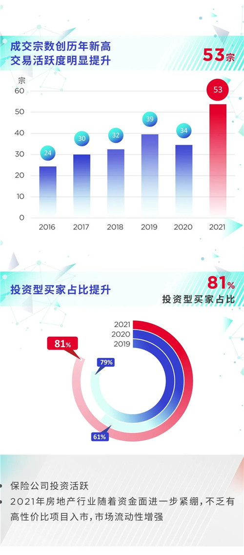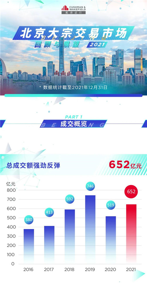 戴德梁行日前發布2021年北京大宗交易市場報告指出,2021北京大宗交易總成交額強勁反彈達652億元,為歷史次高水平;成交宗數創歷年新高,交易活躍度明顯提升。