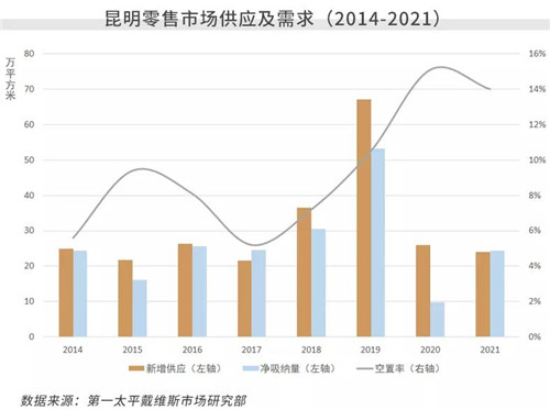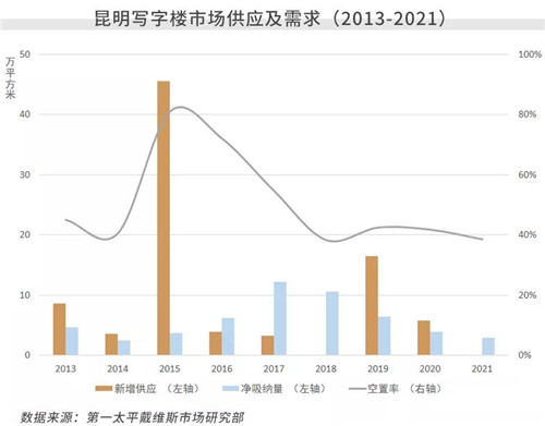 第一太平戴維斯近日發布昆明商業地產市場報告指出,2021年昆明寫字樓市場空置率小幅回落,零售市場供應繼續放緩,需求維持穩定。