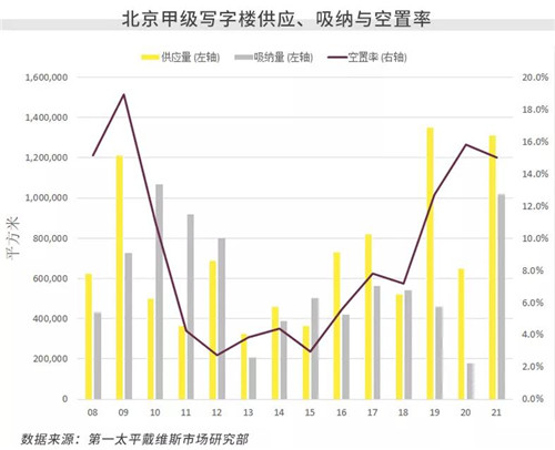 2021年,北京寫字樓市場租賃需求空前高漲,凈吸納量創后疫情階段的新高。其中全市甲級寫字樓的供應、吸納雙雙達到“百萬量級”,其中供應量為131.2萬平方米、吸納量累積達101.9萬平方米。寫字樓市場強勁勢頭貫穿全年,更為可喜的是,自三季度以來全市空置率連續下降,租金則呈現企穩態勢。