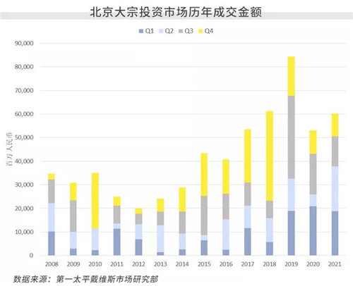 北京大宗投資市場在四季度整體表現較為平淡,該季度投資市場共完成7宗大宗投資交易,交易物業類型主要以寫字樓為主,成交金額合計人民幣96.6億元。2021年全年,北京大宗投資市場總成交金額合計達人民幣602.6億元,較2020年上漲13.4%,自2017年起連續五年成交額突破500億元大關,展現出極強的韌性與巨大的吸引力。