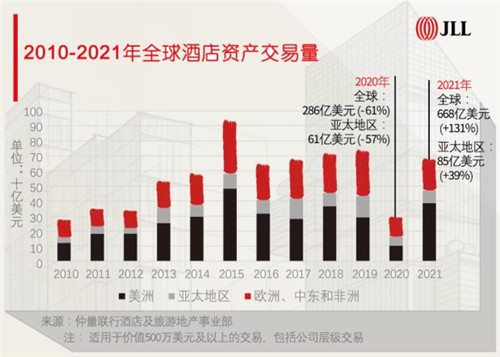 2021年亞太地區(qū)酒店市場(chǎng)交易額為85億美元,占全球酒店交易總額的13%。這一活動(dòng)水平較2020年增長(zhǎng)了39%,但仍比2019年的疫情前水平降低了40%。