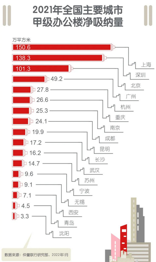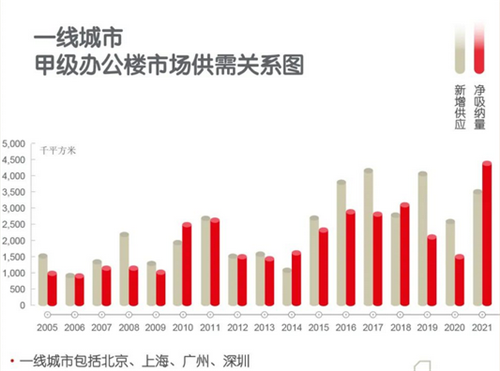 在經(jīng)濟(jì)回暖的支持下,2021年成為了中國(guó)辦公樓市場(chǎng)有史以來需求增量最為強(qiáng)勁的年份之一,全年多個(gè)城市的凈吸納量突破了歷史新高。全年主要城市的凈吸納量達(dá)到660萬平方米。