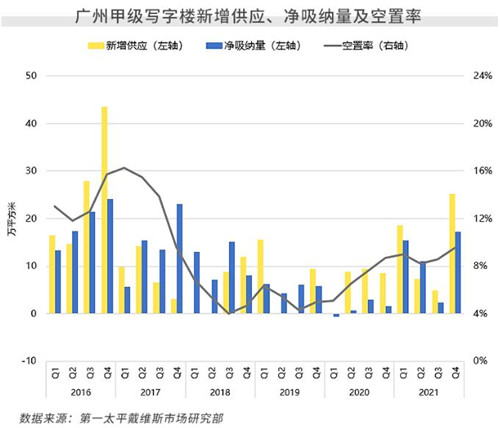 廣州甲級寫字樓租賃市場已于疫情沖擊中反彈,TMT、金融等行業(yè)需求持續(xù)增長。2021年全市年度凈吸納量同比增長近9倍,約達疫情前(2019年)的2.1倍。但受新增供應影響,全市平均空置率仍同比上升0.8個百分點,至9.5%。