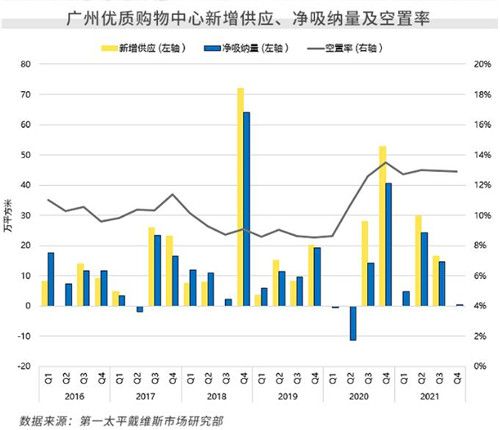 2021年,廣州零售物業(yè)市場品牌擴張情緒已較疫情初期回暖,餐飲、新能源汽車品牌租賃需求表現活躍。全市年度凈吸納量回升至44.1萬平方米,但仍未完全恢復至疫情前水平,約為2019年的96.0%。年末,全市平均空置率同比下降0.6個百分點,至12.9%。