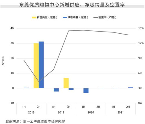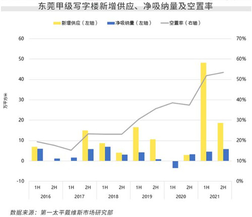 2021年,東莞寫字樓市場租賃需求稍有恢復,全市年度凈吸納量由負轉正,至10.4萬平方米。盡管如此,但與全年逾60萬平方米供應相較,需求增長速度仍不能企及供應規模,全市空置率因此繼續環比上升1.6個百分點,至53.4%。