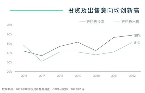 雖然新冠疫情在2021年仍有零星發生,但精準快速的防控措施極大地降低了疫情對市場的影響,中國內地大宗交易市場已恢復常態。CBRE世邦魏理仕近日發布《中國2022年投資者意向調查》顯示,投資者對中國內地商業地產的長期信心增強,59%的受訪者選擇在2022年“更積極投資”,再創2016年首次投資者意向調查以來的新高。