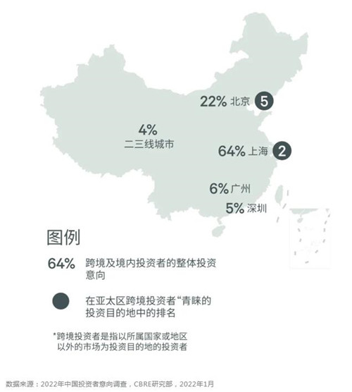 調查發現,64%受訪者將上海作為首選投資目的地,使上海蟬聯境內外買家在中國內地最青睞的投資市場,并且在亞太地區跨境投資目標城市中躍居次席。2021年上海創新高的寫字樓需求和租金走勢的企穩進一步提振了投資者的信心。并且,在主流物業類型之外,生命科學地產、長租公寓等新投資熱點的快速涌現也讓上海呈現出更加多元化的投資機會。位列第二的北京在亞太區跨境投資目標城市中居于第五位,較上年提升一個座次。北京對商辦和物流地產在供應端的限制,以及不可動搖的領先科技和金融中心地位使其得到投資者的重點關注。此外,大灣區作為中國經濟的另一引擎,其倉儲物流設施、面向創新產業和先進制造業的商務園區,以及兼具高品質辦公性能和產業用地內核的新型產業寫字樓項目(M0)也值得關注。