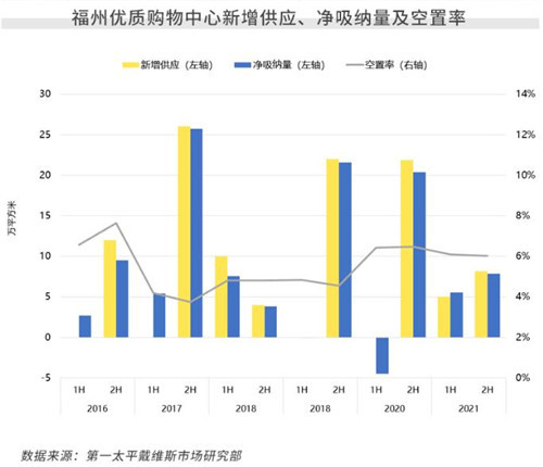 2021年,福州寫字樓各子市場需求表現呈分化趨勢,部分片區受項目產權變更等影響,企業租戶多有退租,空置率隨之上升;而閩江北則錄得多宗大包租成交,去化表現良好。受上述因素綜合影響,全市年度凈吸納量同比下降7.5%,至7.4萬平方米。鑒于年內無新增供應,需求均于存量項目中釋放,全市空置率環比下降1.7個百分點,至20.1%。