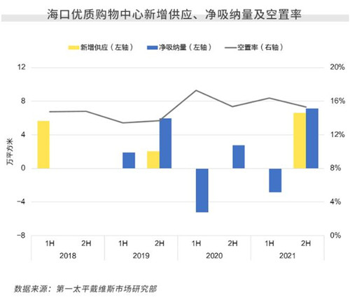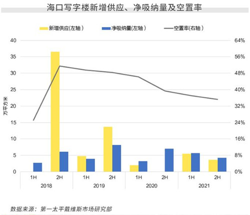 2022年,海口預計迎來21個項目集中入市,全市總存量將同比擴張79.1%。未來市場去化壓力料將因此顯著增加,全市平均空置率預計上升,平均租金則將下降。