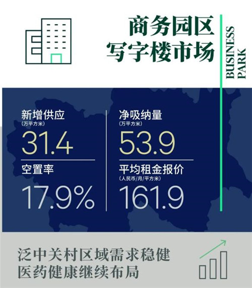 2021第四季度,北京商務園區市場未錄得新項目交付使用,個別項目推遲至明年上半年入市,全年三個新增供應累計錄得31.4萬平米可租面積,僅是去年三成。