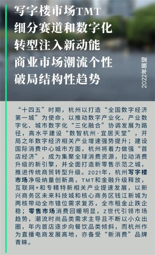 CBRE杭州分公司董事總經理兼戰略顧問部負責人何達表示,“首店經濟”是杭州培育建設國際消費中心城市的重要路徑,2021年已然在新零售、新業態、新模式上做出杭州特色挖掘,各類潮流個性化、精品化、概念化、小眾化首店蓬勃發展,從供給端推動消費升級。展望2022年,約有18萬平方米新增供應,皆位于次級及新興商圈,其中包括龍湖輕資產運營項目吾角商業中心。隨著2022年計劃投入的多條地鐵線運營,將助推亞運會期間杭州文旅消費升級,穩健需求預期延續租金增長態勢。同時,數智杭州持續賦能消費市場國際化、品質化發展,到 2024年之后,順應多家高階商業爆發式增長,杭州將從質上重塑城市商業新格局。