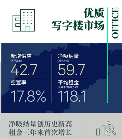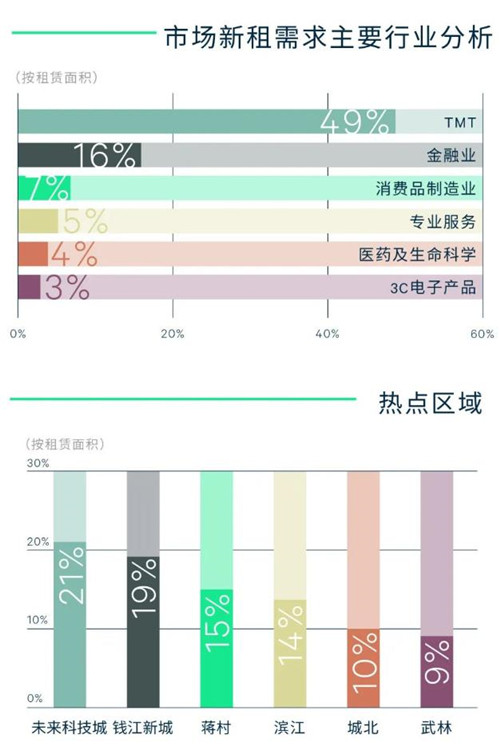 熱點區域方面,未來科技城最為亮眼,除了科技互聯網、直播電商等TMT新設、過渡和整合擴租需求外,也開始涌現多元產業需求譬如金融、醫藥及生命科學、芯片半導體等,以加速科技與產業融合豐富區域租戶結構,實現商務成熟度攀升;核心商務區的錢江新城持續吸引各類金融需求布局,同時房地產建筑、專業服務及外資頭部醫藥及電子消費品類需求也穩步提升,而與之對應的武林、黃龍版塊承接B端業務的金融科技與企業應用軟件及資訊類TMT需求則相對突出,初步顯露成熟市場內謀求煥新及差異化布局趨勢。受核心商務區錢江新城韌性復蘇和新興商務區部分市場科技企業快速擴張去化,租金年內觸底反彈,錄得三年來首次增長,同比提升0.4%,至每月每平方米118.1元。