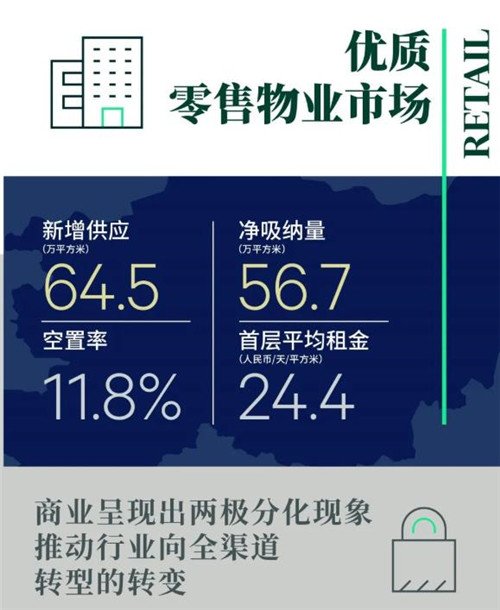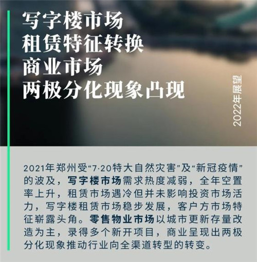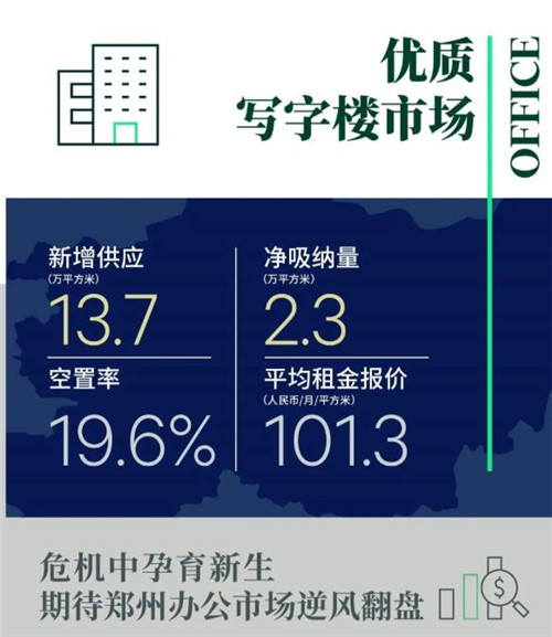 2021年鄭州寫字樓核心區域市場錄得新入市項目13.7萬平方米,非核心區有部分舊改項目入市,市場總量近435萬平方米。其中甲級寫字樓體量近198萬平方米。全年寫字樓租金上半年穩中有升,市場回暖,受第三季度洪水及疫情的自然因素影響,租賃市場漸入窘境,租金回落,較2020年相比,全年租金僅小幅上調2%。全年租賃市場以保險、信托類金融、科技新媒體、建筑類、互聯網相關科技類租戶為主仍積極擴租或新租辦公場所。但因在線教培行業大面積退租,房地產行業進行辦公資源整合,造成甲級辦公樓市場空置率上升5個百分點,至19.6%。受整體經濟環境影響,租賃市場活躍度緩慢恢復周期較長,租賃客戶選擇房源更加謹慎,甲級賬面租金下調8.6%,乙級寫字樓報價租金下調0.7%,空置率提升明顯。