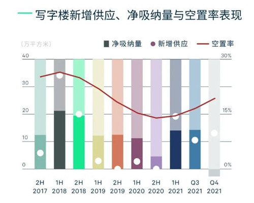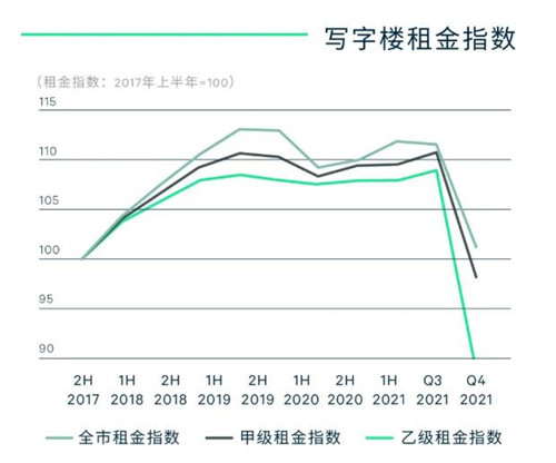 租賃市場穩步發展,客戶方市場特征嶄露頭角。房地產“三道紅線”政策下,鄭州房地產租賃市場出現大面積退租及減租表現,“雙減”政策下,在線教培行業業務收縮,波及第四季度全市寫字樓市場凈吸納量呈現負增長趨勢。全市寫字樓凈吸納量錄得負2.6萬平方米。市場活躍度降低,去化率減弱,凈吸納量出現負增長,CBRE預判2022年市場將逐步進入客戶方市場。