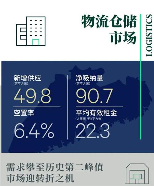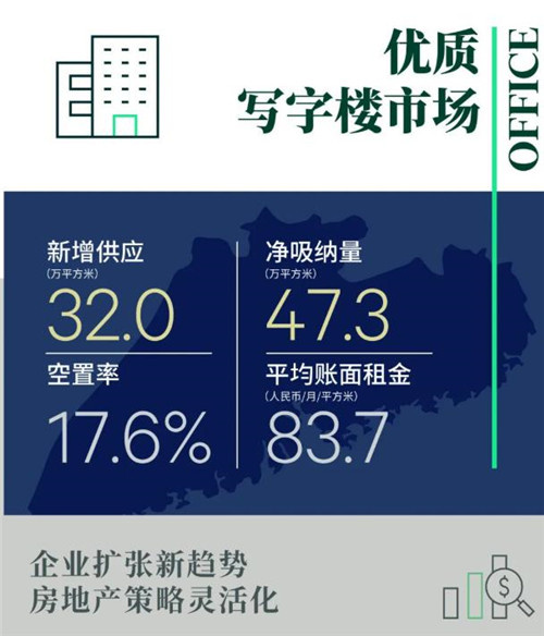 需求顯著回暖,寫字樓吸納量錄得約47萬平方米,同比大幅上漲127.6%,居全國第六位。但全年市場呈先揚后抑的態勢,農歷新年后商務活動快速回暖,上半年吸納量占比全年的71.9%;下半年市場活躍度逐步走低,其中四季度吸納量環比下跌近九成,原因在于疫情反復令租戶持更謹慎態度,以及包括科技、房地產在內的行業調整,引發小波退租潮。盡管如此,市場空置率仍不斷改善,同比下降2.7個百分點至17.6%,系自2005年來的新低。