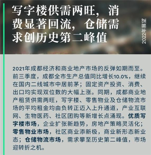 展望未來,由于中國經濟正加速推動新舊動能轉化以實現長期高質量發展,各行業積極尋求新發展方向,或將維持調整基調,預計2022年成都寫字樓需求增長或有所放緩;但中長期來看,需求仍呈上升趨勢。