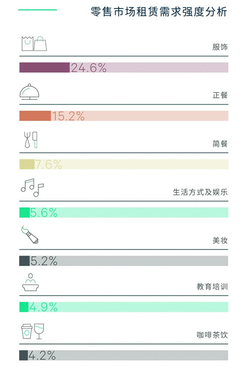 2021年,零售新增需求占比50%。連鎖服飾品牌擴張放緩,取而代之的是凸顯獨立個性的服飾積極擴張,如買手店、獨立設計師品牌,或獨立男裝集合店等。為進一步引發潮流,服飾品牌紛紛在成衣和店鋪設計上走“本土化”策略,并發力社群營銷。悅己趨勢延續,歐美系高化品牌積極擴張,而內資美妝集合店則逐步邁入飽和期。次文化大行其道,衍生強勁的相關消費需求,如該類文化的服飾、潮玩甚至是電子設備。
