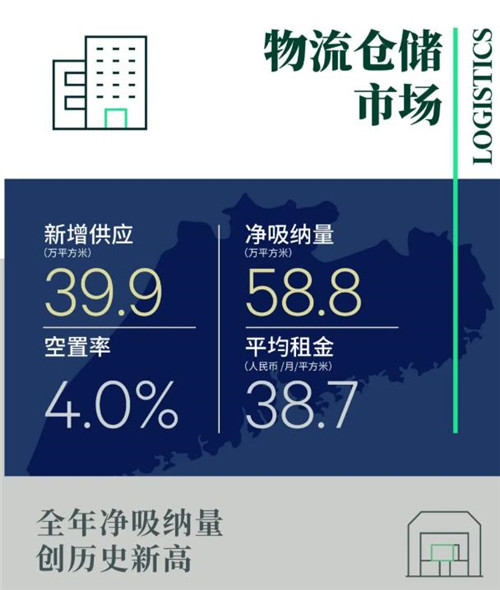 第四季度新增三個保稅項目供應(yīng),其中兩個位于南沙,一個位于白云。南沙的保稅項目持續(xù)受到市場追捧,項目錄得滿租入市。全年而言,廣州共錄得五個項目,共約40萬平方米的新增供應(yīng)投入市場,創(chuàng)歷史新高。但得益于活躍的出口跨境電商需求以及大部分新項目較高的入駐水平,全年凈吸納量達到59萬平方米,同樣創(chuàng)歷史新高。年末空置率下跌至4.0%,同比減少8.9個百分點。年內(nèi)的需求,除了活躍的大型跨境電商以外,生鮮電商、冷庫運營商和第三方物流也錄得在廣州及周邊城市的擴張。較低的空置水平推升全市租金在2021年同比增長3.9%,至年末的每月每平方米38.7元。