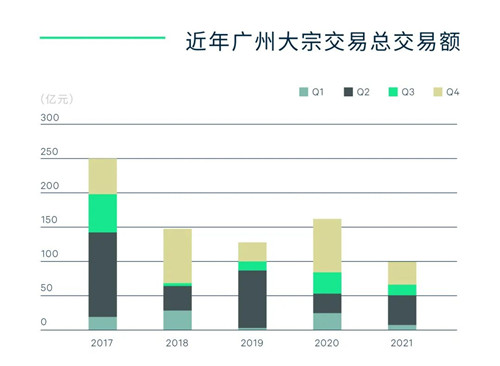 2021年最后一個季度,廣州錄得5宗,總成交金額為34億元人民幣的大宗物業(yè)成交,較上一季度上漲105%,但同比仍減少57%。主要成交包括一棟位于珠江新城的非優(yōu)質(zhì)寫字樓,黃埔區(qū)一座數(shù)據(jù)中心以及富力持有的花都物流園余下的30%權(quán)益。全年錄得交易14宗,總成交金額約為102億元人民幣(未統(tǒng)計關(guān)聯(lián)交易),同比減少38%。