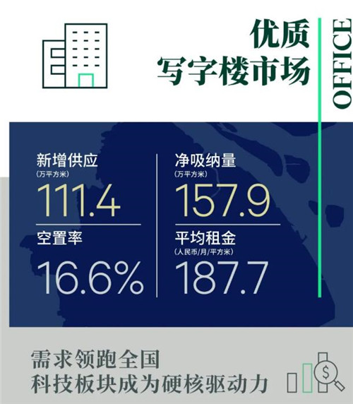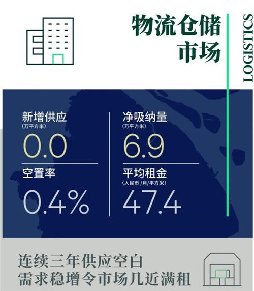 市場需求全面復蘇,全年新增吸納反超新增供應,錄得了98.6萬平方米,帶動空置率同比下降0.8個百分點至3.9%的市場低位。