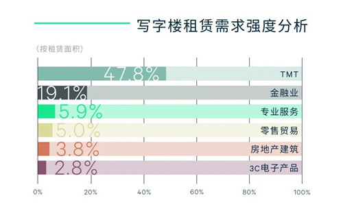金融板塊需求以19.1%占比排名第二,其中銀行和證券機構升級搬遷帶來的傳統金融需求表現更為活躍,而非傳統金融則聚焦財富管理和投資理財兩類業態。以法律和咨詢為主的專業服務業板塊貢獻了近6.0%的需求,全年共錄得40家律所的新租賃成交,除傳統福田CBD外,高新科技園片區也吸引了不少律所進駐。多家來自北京、廣東省其它城市及海外的律所在年內均落地深圳,進行戰略擴張。此外,疫情后出現的“芯片荒”及出境購物受阻催生了寫字樓市場的新需求,包括電子元器件的零售貿易及跨境電商的需求開始凸顯。