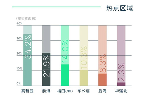 科技企業快速發展刺激過渡期辦公需求的增加,再加上疫情后市場對于靈活辦公的接受度逐步提高,推動共享辦公空間重返優質寫字樓市場并出現一定的擴張勢頭。新增供應壓力下,政府招商助力個別樓宇快速去化的效果顯著。前海板塊年內表現尤為突出,受益于政策推動和片區配套改善帶來的需求提升,前海的空置率在下半年錄得超20個百分點的改善降至25.7%,片區的租金也因此實現微增。