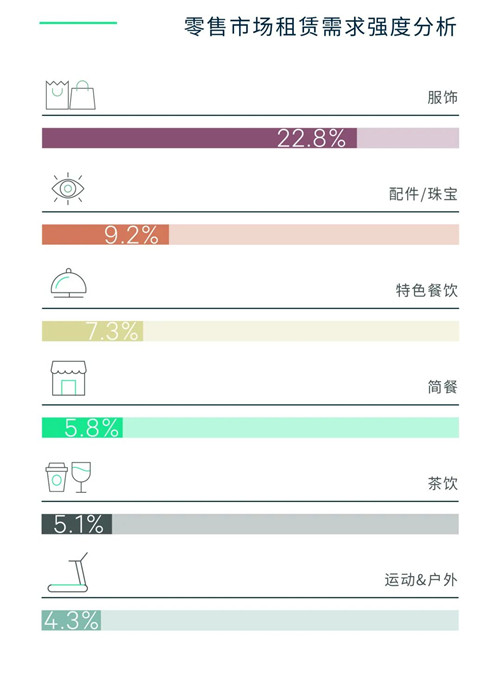 疫情后人們對于黃金等保值品的追求以及對健康的關注度持續提高,年內中高端購物中心共錄得近200家珠寶配件品牌及90家運動品牌開業。相比2020年,年內的運動品牌豐富度進一步提升,國內外均有新品牌在深圳市場開啟擴張之路,包括回力、駱駝、特步、飛悅和鴻星爾克在內的國內品牌,以及首次進入深圳的美國戶外品牌Chums、法國品牌HOKA等。