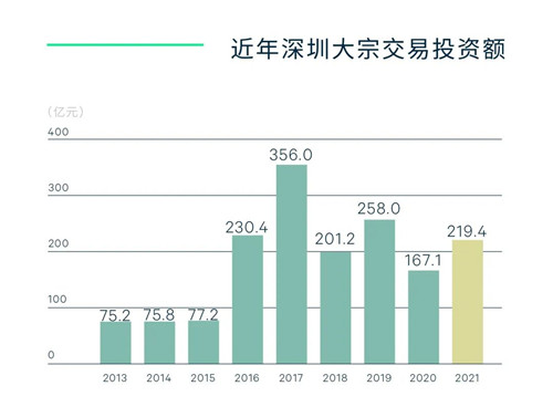 2021年深圳大宗交易市場交易規模已經基本恢復至疫情前水平,全年共錄得23宗交易,整體成交金額共計219.4億元,同比上升31.0%。