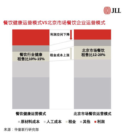 對于餐飲品牌來講,門店租金是運營的一項固定成本,除人工成本外,其他成本相對穩定。據仲量聯行統計,餐飲品牌在北京市場所負擔的租金為同品牌位于二線城市門店的2-3倍。就租售比*而言,餐飲品牌健康的租售比在10%-15%,然而在北京市場中,隨著負擔的租金成本明顯增加,租售比顯著提升至12-20%。租賃成本的增加擠占了利潤空間,提高了餐飲品牌在北京市場的運營難度,迫使其通過調整運營模式和經營策略來適應市場環境。