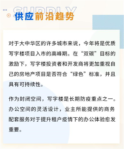近日,戴德梁行發布《大中華區寫字樓供應/需求前沿趨勢》報告指出,今年大中華區許多城市將迎來高品質寫字樓項目入市的高峰期,在雙碳目標的激勵下,寫字樓投資者和開發商將更加重視自己的房地產項目是否符合綠色標準,并且具有可持續性。