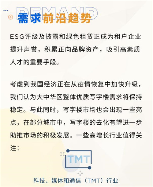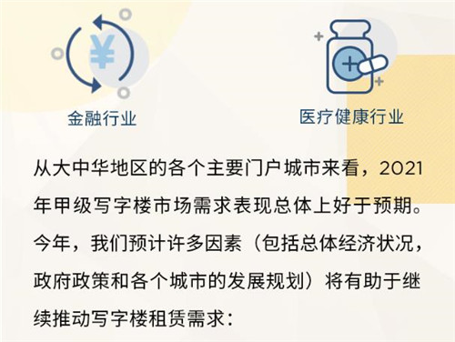 從需求來看,預計大中華區整體優質寫字樓將保持穩定的需求,與此同時,寫字樓市場也會出現一些亮點,一些高增長行業值得關注。