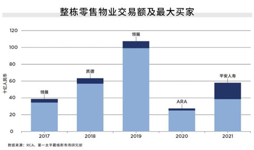在開發(fā)市場,未來供應(yīng)極大概率將由優(yōu)質(zhì)開發(fā)商主導。在投資市場,險資、核心基金也正成為主力買家。中國內(nèi)地零售物業(yè)投資市場總額較2020年顯著復蘇,達人民幣578億元,同比上升107%。其中前三大買家收購金額占比則創(chuàng)下近年新高,達到60%。