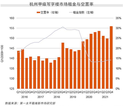 第一太平戴維斯近日發布杭州商業地產市場報告,2021年全年杭州有三個新項目入市,合計新增甲級寫字樓面積29.6萬平方米,由于新入市項目入駐率較低,全市空置率水平在四季度環比上升6.1個百分點達到30.9%;零售市場方面,杭州非核心商圈頻開優質項目 商業多中心發展趨勢明顯。