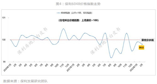 2021年,由于政策疊加效應,伴隨行業出清壓力,市場向下擊破箱體,出現超預期下跌。從保利來訪數據看,上半年周度盤均來訪80-100組,下半年周度盤均來訪50-60組,呈現斷崖式下滑,環比下降38%,同比下降33%,反映出整體市場信心嚴重不足。從全國商品房銷售面積來看,上半年同比增長27%,7月單月同比年內首次轉負,下半年同比下降15%。主流房企銷售額降幅更大,以TOP10房企為例,下半年銷售額同比下降28%。全國商品房銷售均價從8月開始下降明顯,12月商品房銷售均價9512元/平方米,相比年初下降13.8%。保利6048價格指數也從8月開始下跌,并連續5個月下降。土地市場下行明顯,相比一批次供地,全國22城三批次土地出讓金下降47%,流拍或中止出讓率達19%,平均溢價率僅2.3%,地價下降1000-2000元/平方米。