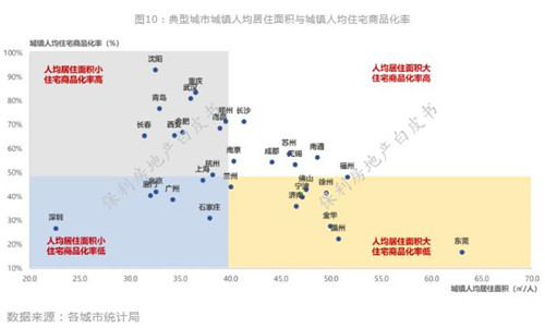 以城鎮人均居住面積和城鎮人均住宅商品化率對不同城市的居住需求分類:①能級越大的城市,居住需求越多元:以廣州為例,10年常住人口增量598萬,“住進來”扎根需求旺盛;住宅商品化率僅39%,“住得好”的商品化改善空間大;50%的家庭戶居住在20年樓齡以上房子,“住得新”換房需求大。②同能級城市,居住需求側重點存差異:如福州人均居住面積大、但住宅商品化率更低,關注商品房改善空間;重慶城鎮化率低,關注就地城鎮化帶來的商品房增量空間。