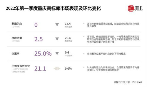 2022年第一季度,重慶高標庫市場未錄得新項目入市。季度內高標庫新增租賃活動放緩,制造業(yè)倉儲需求潛力有望逐步釋放。春節(jié)后,傳統(tǒng)銷售旺季結束,一批零售商及其第三方物流企業(yè)短租到期退租,加之年初新增租賃活動放緩,全市凈吸納量環(huán)比下降至2.5萬平方米。市場整體空置率在供應缺失下保持穩(wěn)定,環(huán)比微降0.6個百分點,至25.0%。平均凈有效租金較上季度保持穩(wěn)定,報21.1元每平方米每月。