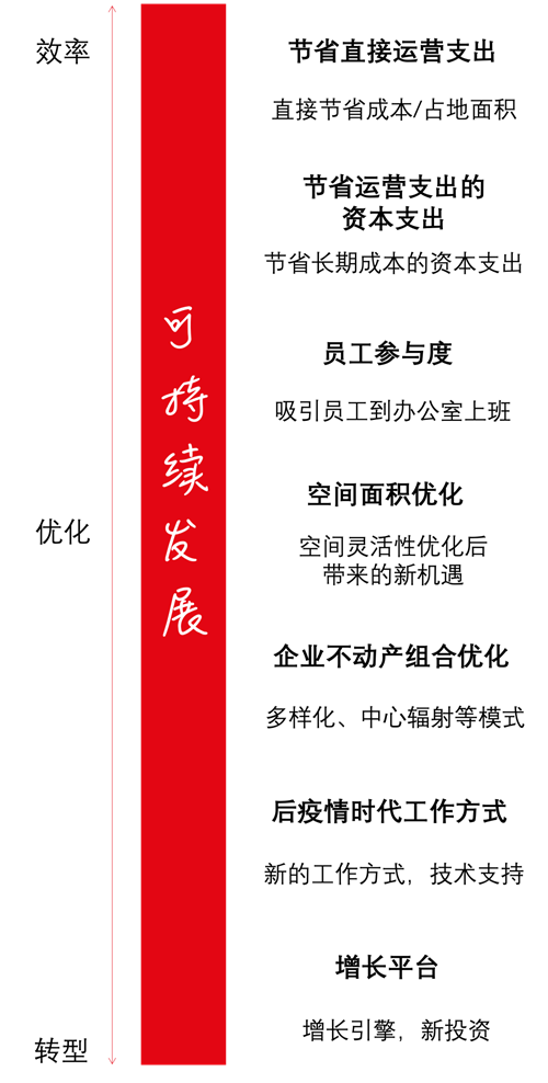 驅動因素:下圖反映了企業的業務戰略與對應的辦公場所策略。圖表左側的業務戰略從上方的“效率”開始,一直到下方的“轉型”,分別展示對應采取的辦公場所策略,并且皆以“可持續發展”做為終極目標。同時,具體哪些策略能夠應用、及應用的優先級,也受到所處行業、細分市場、地域、文化和疫情的影響。