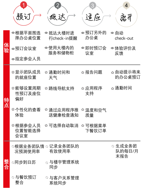 下圖展示了仲量聯行為客戶開發的體驗路徑圖示例,用于幫助確定辦公室預訂應用程序需包含哪些功能。