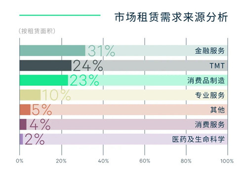 從行業(yè)來看,金融業(yè)、TMT和消費品制造業(yè)占據(jù)全市前三大需求。區(qū)域表現(xiàn)分化,珠江新城的金融業(yè)獨占鰲頭,占比高達(dá)45%,基金、證券和保險代理有擴(kuò)張;琶洲繼續(xù)以TMT為需求首位,成交集中在游戲、電商以及“互聯(lián)網(wǎng)+”政務(wù)服務(wù)領(lǐng)域。
