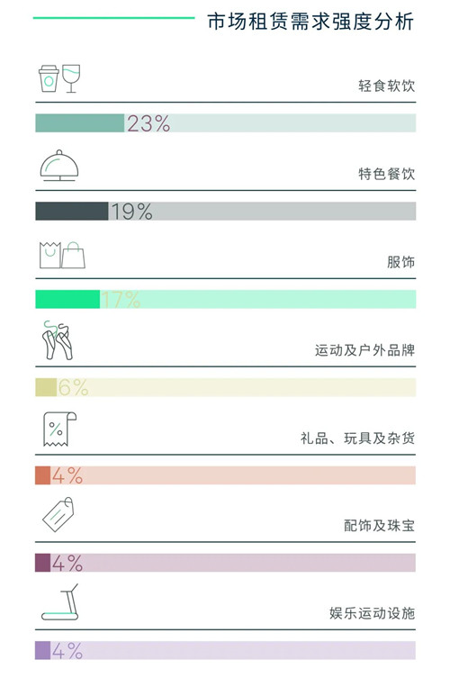 餐飲業(yè)表現(xiàn)依然突出,在重點監(jiān)測的商場中,47.8%的新增租戶都是餐飲品牌。特別是以咖啡和中式甜點為代表的輕食軟飲占比多達(dá)23.0%,一方面因為部分相關(guān)品牌獲得融資,得以進(jìn)行門店擴(kuò)張;另一方面,不少業(yè)主把大餐飲或主力租戶鋪位調(diào)改為多個小餐飲鋪位,增加了這些零售商進(jìn)入優(yōu)質(zhì)購物中心的機(jī)會。而在零售業(yè)態(tài)方面,服裝品牌新店開業(yè)占比17.4%,其中潮牌Madness首進(jìn)廣州。而在其他體驗類業(yè)態(tài)方面,教育類業(yè)態(tài)出現(xiàn)退租現(xiàn)象,主要是學(xué)科類教育租戶,而素質(zhì)類教育機(jī)構(gòu),如機(jī)器人、編程和音樂培訓(xùn)等租戶,仍錄有新租。另外,運動和娛樂業(yè)態(tài)方面,本季錄得太極和泰拳柔術(shù)等區(qū)別于以往的健身類新門店。租金方面,全市首層租金保持大體平穩(wěn),季內(nèi)無漲跌,季末租金為每天每平方米28.2元。