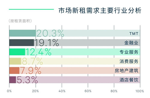其次,金融業和專業服務業居季內新增需求二、三位,分別占比19.1%、12.4%。其中,成渝共建西部金融中心釋放金融業發展新機遇,季內保險、證券等企業積極擴張,且逾千平方米及以上大面積成交占比48.3%;而專業服務業中最為矚目的是律所,占比季內該行業需求的20.9%。此外,季內包括口腔、醫美等類經營性消費服務業態的占比亦不斷增加,這也側面反映出業主積極應對市場環境波動在租賃策略上作出的適度調整。