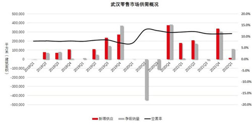 中糧大悅城開業,為武漢優質零售市場注入新的活力。2022年一季度,武漢優質零售市場僅迎來一個優質項目開業,新增供應13.6萬平方米。光谷中心城區域的中糧大悅城是大悅城控股落子武漢的首個商業項目,其入市彌補了區域的優質生活商業配套空白,為武漢的優質零售業市場注入了新的體驗和活力。截至到3月底,全市優質零售物業市場總體量達到794.6萬平方米,環比增加1.7%。