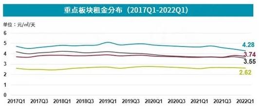 從租金表現來看,許多寫字樓業主在租金和租賃條件上不得不作出更多讓步,以期在全球性經濟持續下滑、疫情等多重因素沖擊的背景下維持現有租戶和吸引新租戶。本季度甲級寫字樓平均租金水平穩中略降,環比下降0.07%至人民幣2.81元/平方米/天。