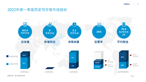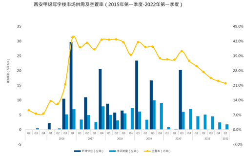 本季度全市無新增項目入市,截至2022年第一季度末,西安市甲級寫字樓市場總存量依然保持在176.9萬平方米。