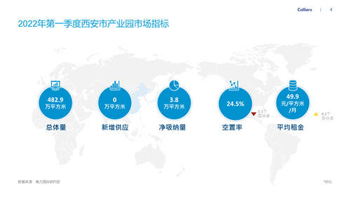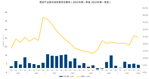本季度產業(yè)園市場凈吸納量較上季度小幅下降,約為3.8萬平方米,但仍高于甲級寫字樓市場,其中受益于產業(yè)政策本季度多家智能制造型企業(yè)入駐西咸新區(qū)子市場?罩寐史矫,由于疫情影響,全市產業(yè)園市場空置率小幅下降1.1個百分點,達到24.5%。