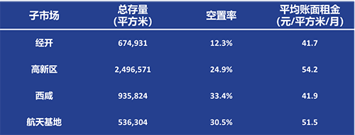 分板塊來看,得益于軟件通信及醫(yī)藥檢測等行業(yè)的活躍,本季度西咸子市場表現(xiàn)亮眼,空置率環(huán)比下降4個百分點至33.4%;而高新子市場需求放緩,錄得凈吸納量7,147平方米;航天子市場空置率錄得30.5%。
