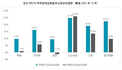 截至2021年12月31日,亞洲市場上活躍的REITs共計198支;總市值達3,041億美元,為亞洲REITs市場史上總市值最高一年,同比上升8.1%。其中日本、新加坡、中國香港三地REITs市值合計占比近九成。聚焦三地市場,分派收益率從高到低依次為中國香港(7.1%)、新加坡(6.1%)、日本(3.8%),杠桿率從高到低依次為日本(44%)、新加坡(37%)、中國香港(27%),一年期年化綜合收益率從高到低依次為日本(20.1%)、中國香港(12.4%)和新加坡(5.5%)。從資產類型看,亞太區域中工業/物流REITs表現最為優異,全年錄得綜合收益率24.7%。