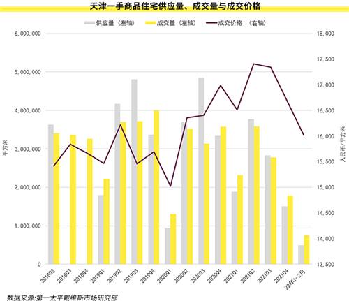 在疫情反復等因素的影響下,天津住宅市場的房源供應量和成交量驟然減少,成交均價也有所下跌。1-2月份新建住宅供應面積49萬平方米,環比、同比分別下降67.4%、56.6%;成交面積75萬平方米,環比、同比分別下降58%、36.8%;成交均價為每平方米16,015元,環比、同比分別下降4%、2.9%。