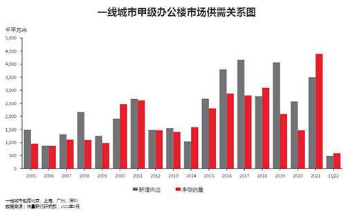 2022年伊始,盡管受到國內(nèi)疫情反復和國際局勢動蕩所帶來的多重壓力,全國整體經(jīng)濟開局仍保持平穩(wěn)增長趨勢。根據(jù)國家統(tǒng)計局4月18日公布的數(shù)據(jù)顯示,2022年一季度國內(nèi)生產(chǎn)總值為27.0萬億元,同比增長4.8%。得益于全國經(jīng)濟平穩(wěn)運行和開年來政策端對企業(yè)的積極扶持,一季度全國辦公樓市場整體表現(xiàn)持穩(wěn)。內(nèi)資頭部企業(yè)引領租賃需求,其中金融、TMT、大健康行業(yè)等行業(yè)的擴張也持續(xù)推動市場需求增長。自3月起,全國多地疫情反復,經(jīng)濟和市場面臨短期下行壓力,將對二季度的市場信心和預期造成一定影響。
